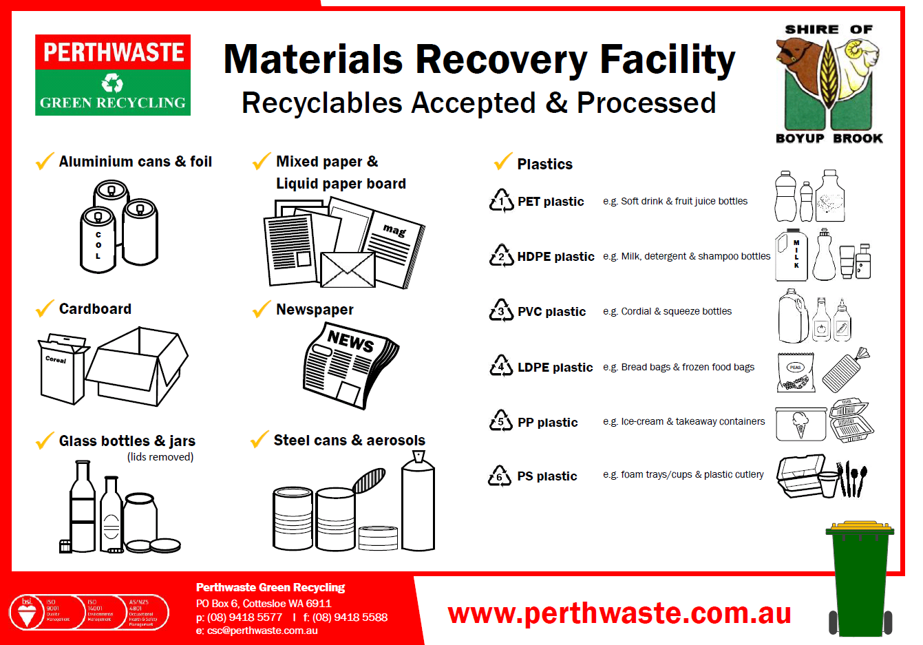 A kerbside pick up is also provided in the Boyup Brook town for recyclable materials. Recycling bins are collected every second Wednesday. For more details about recycling visit General Waste | Reliable Collections | Veolia