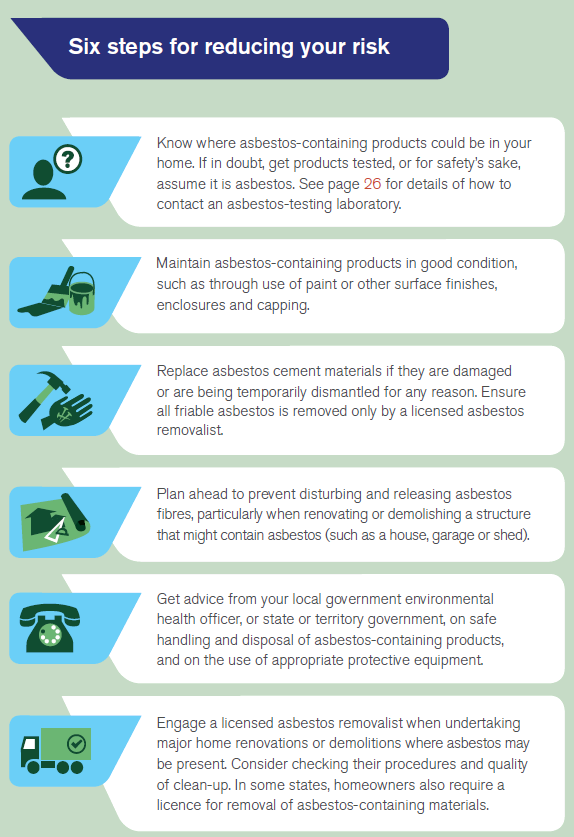 Follow the six steps below for reducing your risk with asbestos. For more information read Asbestos A Guide for Householders and the General Public. The do's and don'ts for handling asbestos can be found on pages 29 - 34. For more information on asbestos removal contact the Shire Environmental Health Officer 9765 1200.