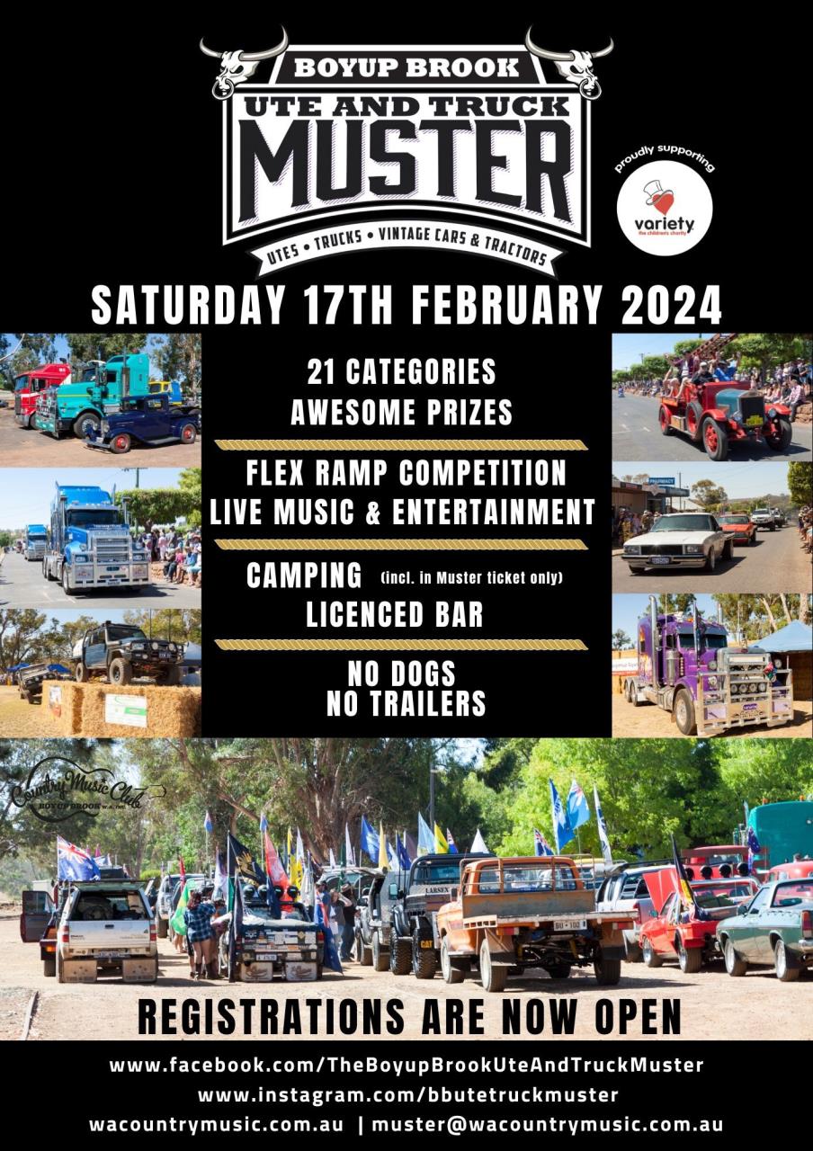 Don't miss the 2024 Ute & Truck Muster on February 17th, seamlessly partnered with the Boyup Brook Country Music Festival. Immerse yourself in the vibrant parade as it winds through town, featuring classic cars, utes, and trucks. Join us for a day of community, horsepower, and musical festivities in the heart of Boyup Brook!