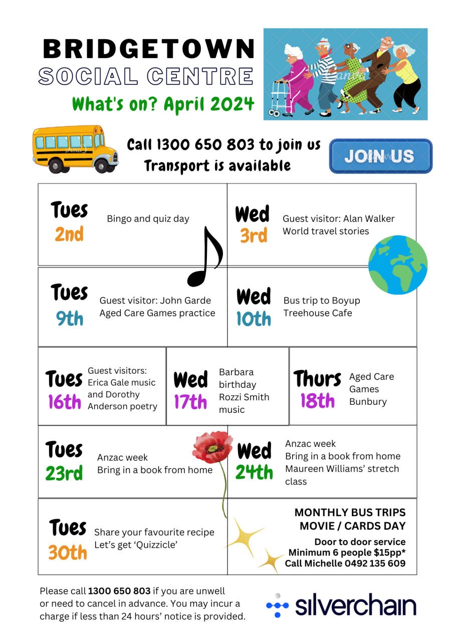 We are always welcoming new Bridgetown Social Centre club members, as well as new Greenbushes and Boyup Brook groups. We have a bus and staff available for ongoing day trips as well as centre based day sessions. We would like to hear your feedback about what residents in surrounding communities would like, in terms of group social support (card days, movie days) and outings (art trail festival, BBQ’s, museums, café’s)