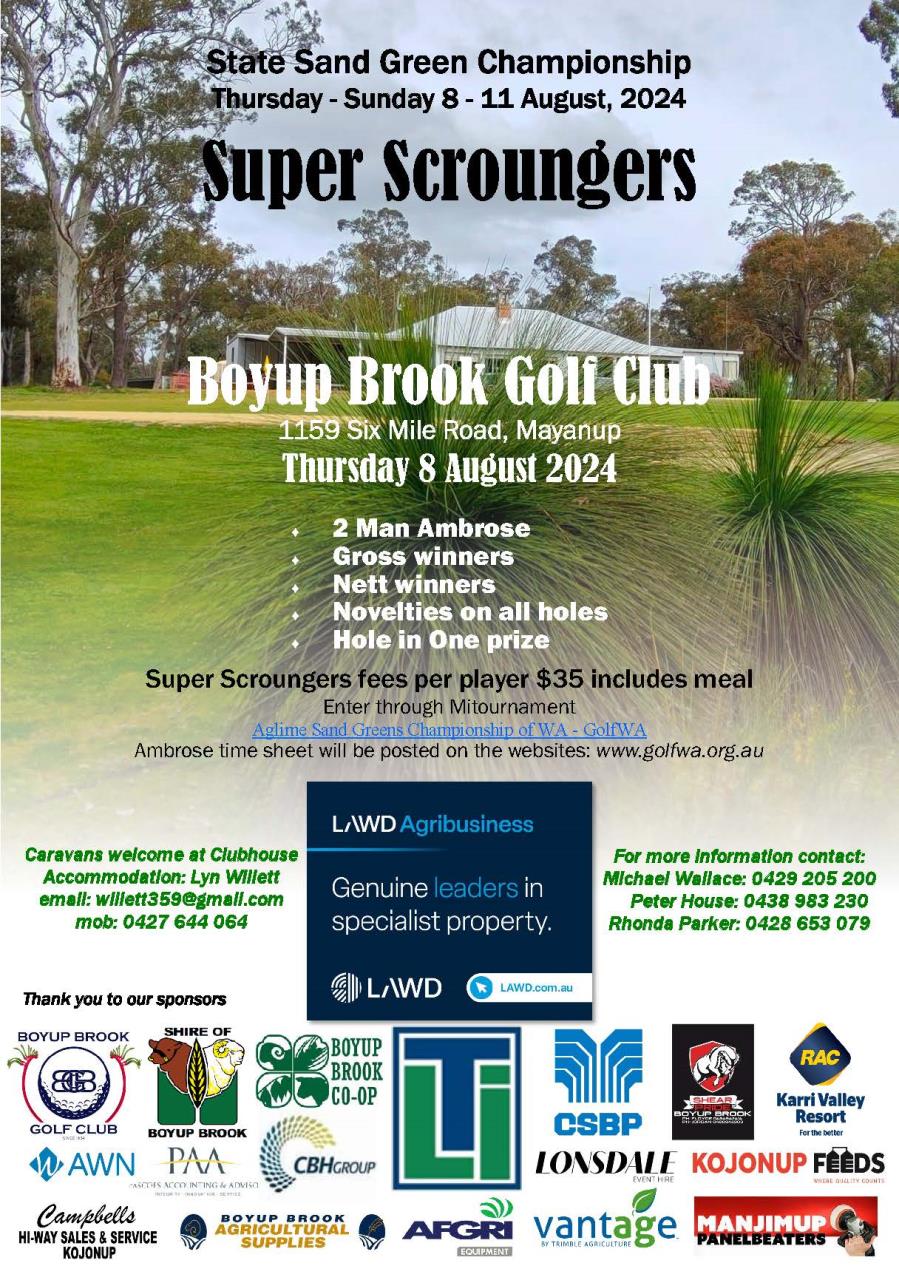 We're thrilled to announce that Boyup Brook Golf Club will be hosting the prestigious W.A. State Sand Greens Golf Championship from Thursday 8th to Sunday 11th August 2024! π This championship is not only a showcase of golfing talent but also a wonderful opportunity to shine a spotlight on our small rural community.