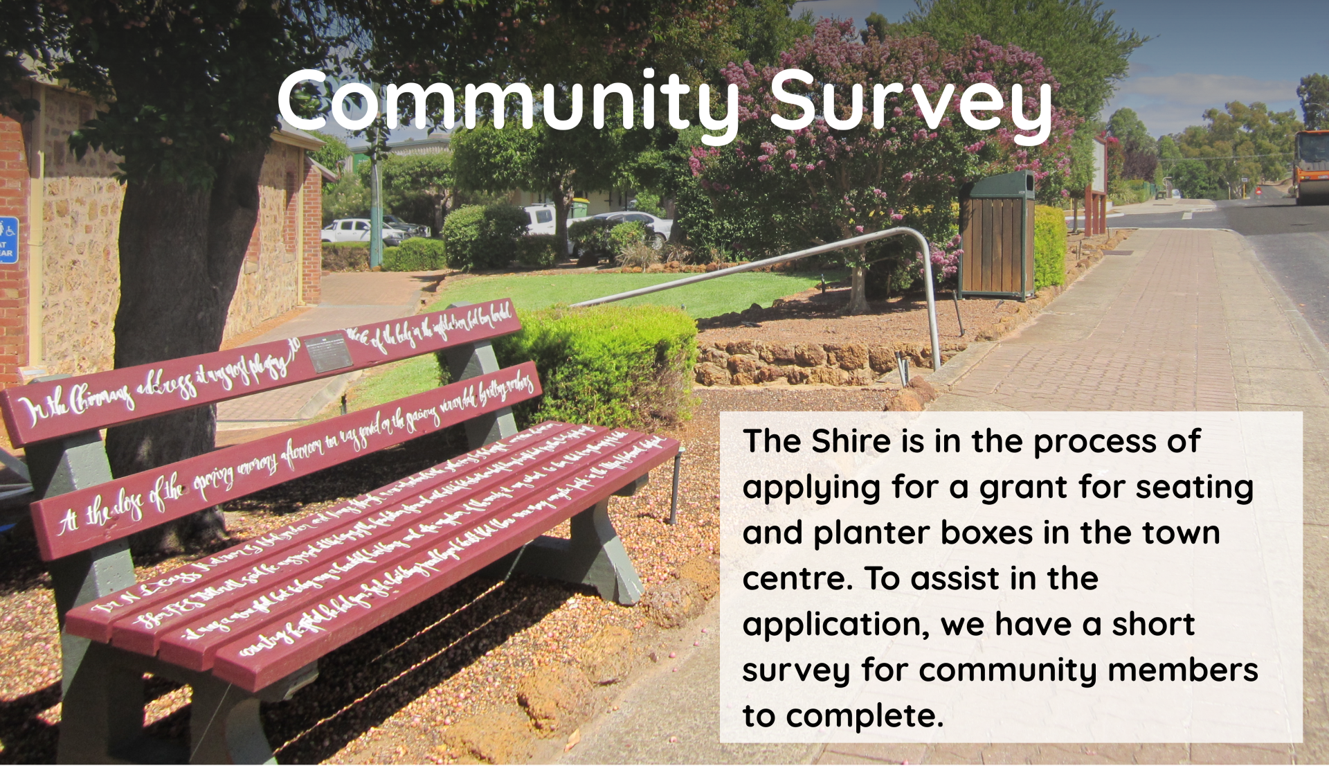 The Shire is in the process of applying for a grant for seating and planter boxes in the town centre. To assist in the application, we have a short survey for community members to complete which will identify locations that best suit our community. The survey can be accessed here https://www.surveymonkey.com/r/RMP5D85 or by the QR code below. Hard copies are also available at the Shire Administration Office. The survey closes on Sunday 6th April 2025.