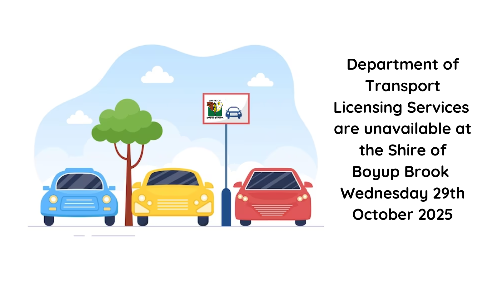 Department of Transport licensing services at the Shire of Boyup Brook are unavailable for the remainder of the day, Wednesday 15th October 2025.