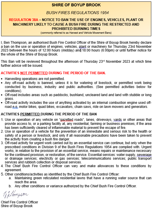Harvest and Vehicle Movement Ban Thursday 23rd November 2023 from 12:00pm