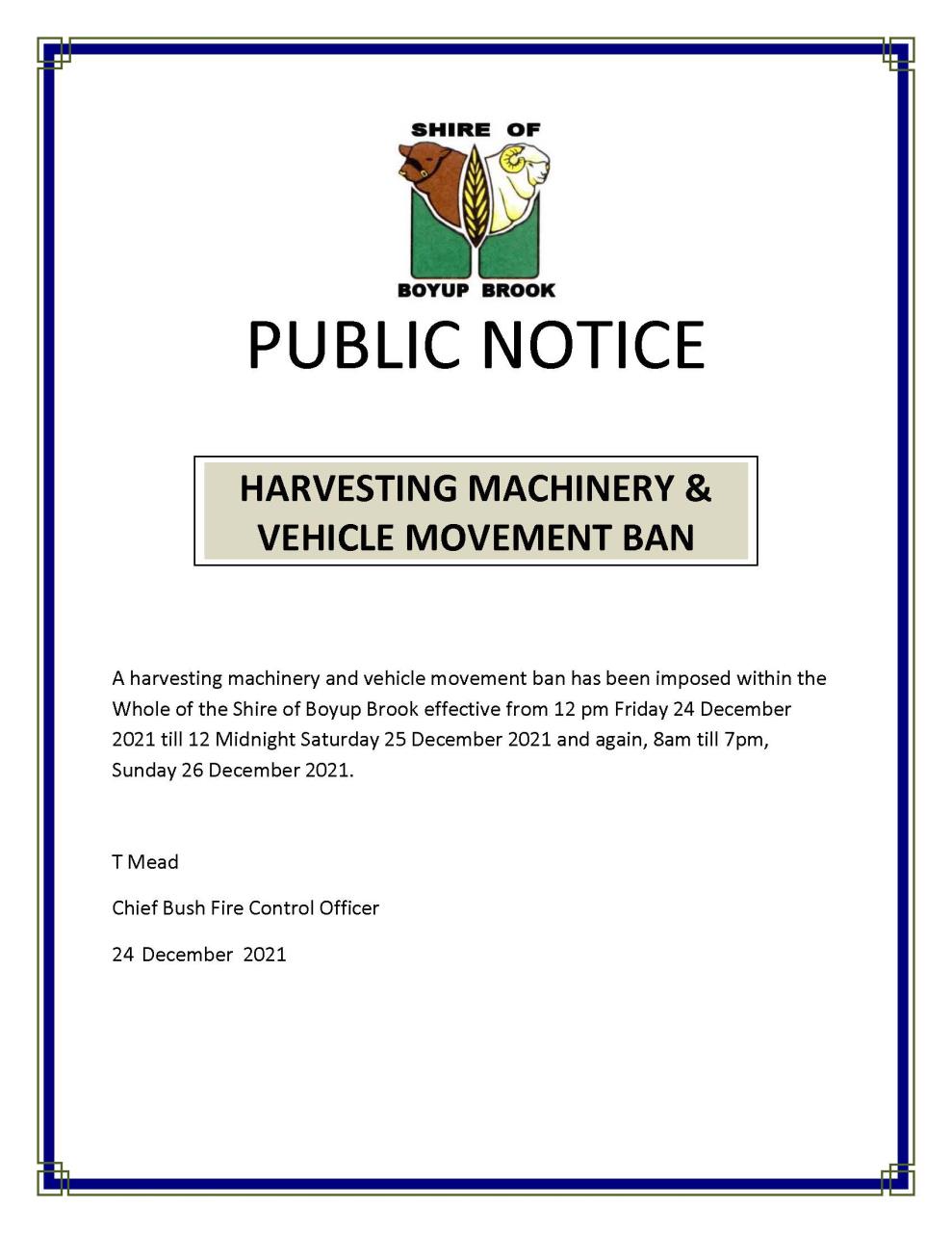 Harvest, Machinery and Vehicle Movement Ban Xmas 2021