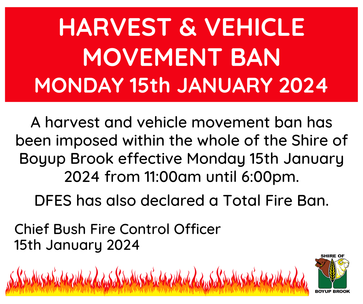 A harvest and vehicle movement ban has been imposed within the whole of the Shire of Boyup Brook effective Monday 15th January 2024 from 11:00am until 6:00pm. Please click HERE for more information.