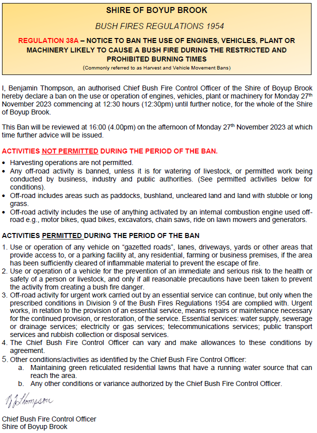 Harvesting Machinery and Vehicle Movement Ban Monday 27th November 2023 from 12:30pm