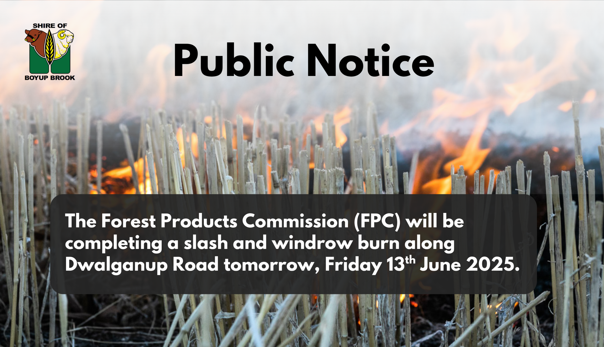 FPC will be completing a slash and windrow burn along Dwalganup Road tomorrow. As there may be smoke present, please drive with care and to road conditions.