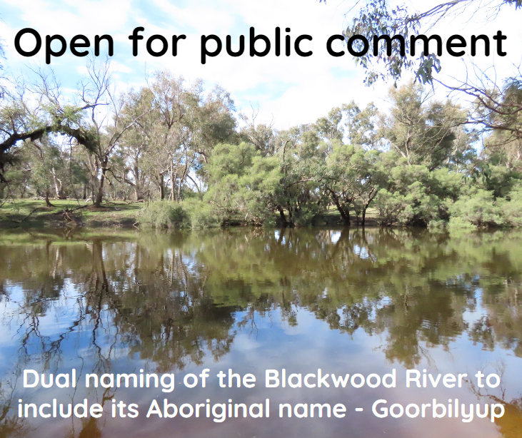 The Shire of Boyup Brook is seeking public comment prior to Council considering the DUAL NAMING of the Blackwood River to include its Aboriginal name – Goorbilyup. This proposal has been initiated by the Shire of Bridgetown Greenbushes and is being presented to all Shires that run along the Blackwood River - Shire of West Arthur and Boyup Brook, through Kaneang Country, to the Shire of Bridgetown-Greenbushes, Nannup and Augusta-Margaret River, through Bibbulmun and Wadandi country. This proposal has no cost to the Shire.