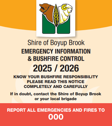 Note - Restricted and Prohibited Burning Times may be varied due to seasonal changes. Any changes will be advertised in a local newspaper circulated within the Shire's district. It is YOUR responsibility to check with the Shire of Boyup Brook or the Chief Fire Control Officer, to ensure you are aware of any variations.