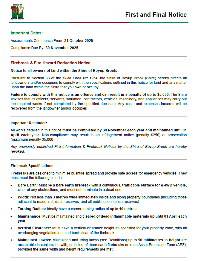 The Firebreak Notice contains information on your responsibilities in regard to firebreak installation and fire prevention measures as well as Brigade contacts.